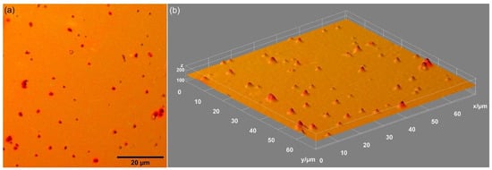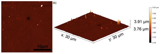 Complementary complex information regarding the surface topography of the PANI-IO thin films was revealed with the aid of AFM studies. The specific 2D AFM topography of an area of 30 × 30 µm2 of the PANI-IO thin films is presented in Figure 4a.