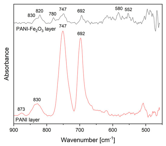 The FTIR spectra of PANI-IO and PANI layers deposited on silicon substrates are presented in Figure 6. Usually, the metal–O–metal bonds manifest vibrations in the 650–550 cm−1 spectral range [28,33]. Therefore, we attributed the IR bands observed in the FTIR spectrum of the PANI-IO layer at 580 and 552 cm−1 to Fe-O-Fe bonds [34], while the IR band at 466 cm−1 was assigned to Fe-O (metal-O [28,33,34]).