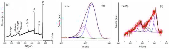 The general spectrum of PANI-IO (a), the N 1s XPS core-level spectrum of PANI-IO (b), and the Fe 2p high-resolution core-level XPS spectra of PANI-IO (c).