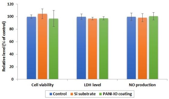 The biocompatibility of the Si substrate and PANI-IO coating was assessed with human cells after 24 h of incubation by evaluating the cell viability, membrane integrity, and inflammatory response induced in Caco-2 cell cultures (Figure 8).