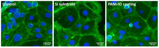 Cell morphology was analyzed through the fluorescence labeling of F-actin cytoskeleton. The fluorescence microscopy images presented in Figure 9 revealed that Caco-2 cells cultured on the Si substrate and PANI-IO coating preserved their epithelial-like specific morphology and maintained their capacity for adherence and spreading. Moreover, the cytoskeleton integrity and organization were not altered, and cell–cell interactions were maintained in both experimental conditions, similar to the control. Accordingly, these results indicated a high tolerance of cells toward these materials, and they did not seem to disturb the proliferative capacity and specific morphology of Caco-2 cells. Our findings are also supported by other studies. For example, Liu et al. reported that PANI films deposited over a Si substrate promote a greater cellular adhesion and proliferation of PC-12 cells than films on a Si substrate without a polymer, possibly due to the rough surface of PANI [44].