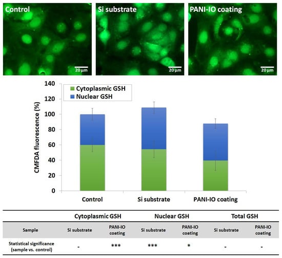 Cellular reduced glutathione (GSH) is the most abundant thiol antioxidant and protects cells against oxidative damage. In mammalian cells, GSH is biosynthesized in the cytosol, but it is also distributed to different intracellular organelles including the nucleus. The transport of GSH from the cytosol plays an important role in the regulation of glutathione redox homeostasis in the cytosol and other subcellular compartments [45]. In this study, the GSH content was estimated in cells incubated for 24 h in the presence of a Si substrate and PANI-IO coating by quantifying the CMFDA fluorescence of the cytosol and nucleus. As shown in Figure 10, the cytoplasmic GSH level of cells cultured on the PANI-IO coating significantly decreased (p = 0.0002 ***) by 20.3% compared to the control, while the nuclear GSH content increased by 8.2% (p = 0.01 *). A significant elevation in nuclear GSH content by 14.2% (p = 0.0002 ***) compared to the control was also observed in cells cultured on the Si substrate. However, we registered no significant modifications in the total GSH content of samples, related to the control, suggesting only a possible redistribution of the GSH pool between nuclear and cytoplasmic cellular compartments, without compromising cell redox status. Redistribution of GSH toward the nucleus in the presence of a PANI-IO coating might be a defense cell response to a possible perturbation of subcellular GSH redox homeostasis triggered by iron ions released from the PANI-IO coating and subjected to Fenton reactions upon cell internalization. Previously, it was reported that GSH promotes Fenton degradation by accelerating the Fe(II)/Fe(III) cycle, thus producing a higher quantity of hydroxyl radicals [46]. A recent study found that the Cu(II) ions released from iron–copper co-doped PANI nanoparticles (Fe-Cu@PANI) can also undergo redox reactions in the presence of GSH [47]. Moreover, intranuclear accumulation of GSH promotes proliferation [48]. All these might indicate that a PANI-IO coating could promote the induction of cell proliferation, thereby contributing to a beneficial tissue response and clinically relevant performance.