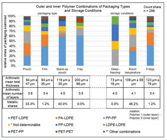The following section is intended to provide a descriptive insight into the wide variety of multilayer packaging structures. For this purpose, Figure 2, Figure 3 and Figure 4 show the number of layers, total thickness, outer and inner polymer combinations, storage conditions for packaging types, and packaged goods for the ML sample (296 multilayer items, total mass 1828 g). These parameters were chosen as they can provide considerable information to assist the recyclability of multilayer packaging. Unless otherwise stated, the percentages in chapter 4.3 are to be understood as count shares.