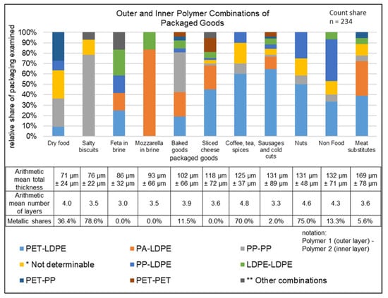 The proportions of polymer outer and inner layers, depending on the category of packaged goods, are illustrated in Figure 4. Only packaging items of which at least ten were available were selected (see Table 6). This resulted in a total of 234 packages divided into 11 of the 25 categories. Furthermore, the category “not determinable” could contain further combinations. In 10 of the 11 categories, more than two different combinations of outer and inner layers were used to package the same goods. For mozzarella in brine, only two different material combinations (PA–LDPE and LDPE–LDPE) were found. The greatest variety of packaging consisting of different material combinations was found in sliced cheese packages (nine), followed by baked goods and sausages and cold cuts (seven each).