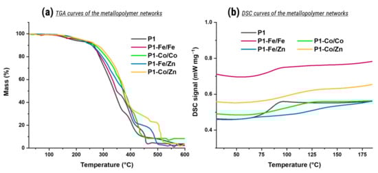 | Polymer or Metallopolymer Network | Degradation Temperature 1 Td (°C) | Glass Transition Temperature 2 Tg (°C) | |