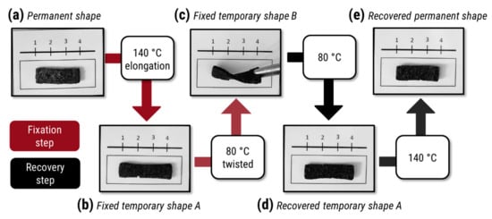 - Meurer, J.; Rodriguez Agudo, J.A.; Zechel, S.; Hager, M.D.; Schubert, U.S. Quantification of triple-shape memory behavior of polymers utilizing tension and torsion. Macromol. Chem. Phys. 2021, 222, 2000462. [Google Scholar] [CrossRef]