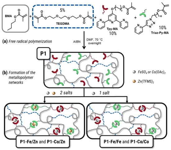 | Metallopolymer Network | m (P1) (g) | Metal Salt | m (Metal Salt) (mg) | n (Metal Salt) (mmol) |