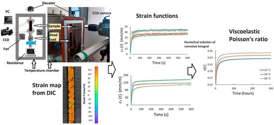- Farfan-Cabrera, L.I.; Pascual-Francisco, J.B. An Experimental Methodological Approach for Obtaining Viscoelastic Poisson’s Ratio of Elastomers from Creep Strain DIC-Based Measurements. Exp. Mech. 2022, 62, 287–297. [Google Scholar] [CrossRef]