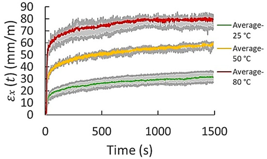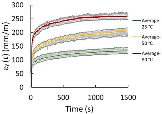 Once the creep data ( and ) were obtained by DIC, the mean creep strain functions ( and ) were determined from the three repeats. Afterwards, both mean creep functions were used to predict the functions for each material and condition by Equation (2), which is a convolution integral equation based on a secure analytical foundation of the viscoelasticity theory [9].