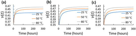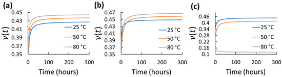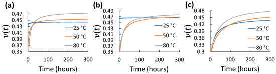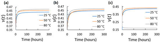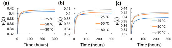 Viscoelastic Poisson’s ratio of VMQ at different temperatures and stress: (a) 200 kPa; (b) 400 kPa; (c) 600 kPa.