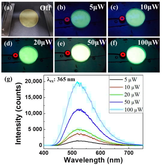 Figure 3. (af) Digital camera images of Alq3/PDMS polymer composite films, when irradiated with UV lamp power depending on the power of (a) 0 μW, (b) 5 μW, (c) 10 μW, (d) 20 μW, (e) 50 μW, and (f) 100 μW, respectively. (g) LCM PL results of the corresponding to the previous luminescence experimental image depending on the exposure power.