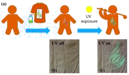 Figure 4. (a) Schematic illustrations of UV visualizations on the T-shirt by spray-printing the crystalline Alq3 micro-rod solution. (b,c) Magnification of the Alq3 solution printed parts in the T-shirt. UV lamp (maximum power of 20 μW) is turned off (b) and on (c).