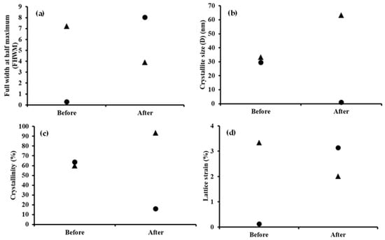 - Vashista, M.; Paul, S. Correlation between full width at half maximum (FWHM) of XRD peak with residual stress on ground surfaces. Philos. Mag. 2012, 92, 4194–4204. [Google Scholar] [CrossRef]