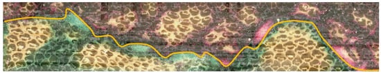 Two FBMs, separately dyed with Safranine T and Toluidine Blue O, were hot-pressed to prepare BSCs under the optimum process conditions. As shown in Figure 3, uneven dyeing outlined the shape of the bamboo fiber bundles, where the cracks generated by the defibering process were compressed and cross-linked with the PF resin. In addition, the yellow curve—that is, the boundary between the two FBMs after hot pressing—shows a comb-meshing structure. Compared with other bamboo/wood composites, this bonding structure is unique and stable and provides BSCs with higher strength and superior water resistance.