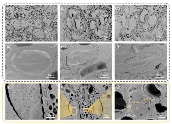 The parenchyma tissues and vessels of the FBMs were densified during hot pressing. As the density increased, the degree of deformation increased, according to the SEM diagrams shown in Figure 5. It could be seen that, when the density was less than 1.15 g/cm3, more PF resin remained in the lumens. At 1.30 g/cm3, the cell cavity and vessels were almost closed, causing large internal stress, with less PF resin present—which meant that the binding force of the PF resin on cell rebound would be reduced if the samples were in a hydrothermal environment, resulting in a decline in diameter stability. This inference is consistent with the previous water-resistance test results. In addition, many nanopores with diameters ranging from tens to hundreds of nanometers could be observed in the cured PF resin (Figure 5g–i).
