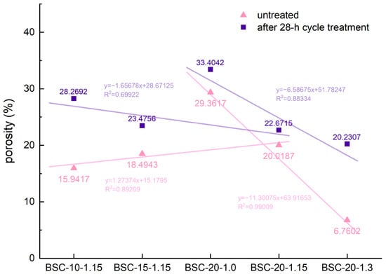 Figure 9. Porosity of the BSC samples before and after 28-h cycle treatment.
