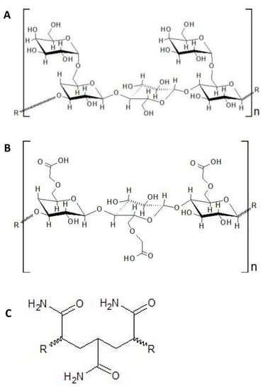 Chemical structure of (A) guar gum, (B) CMC, and (C) PAM.