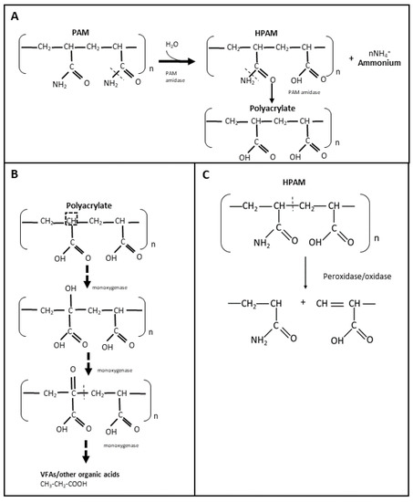 Microbial utilization of PAM and HPAM through hydrolyzation with amidase (A), suggested biodegradation of PAM by oxidation with monooxygenases (B), and PAM degradation mechanism by radical-forming enzymes (C).