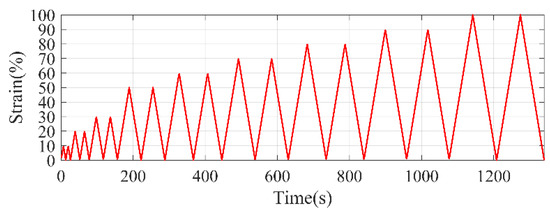 Die type I coupons of S1 and S7 polyurea materials were tested under non-reversal cyclic tensile loading. The coupons, test setup, and data acquisition were similar to the tensile tests previously discussed. The loading rate used for the test is 5.08 mm/min (0.2 in/min). Three coupons for each polyurea material were tested under cyclic tensile loading with a loading pattern as shown in Figure 4.