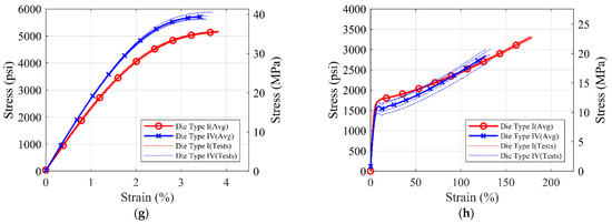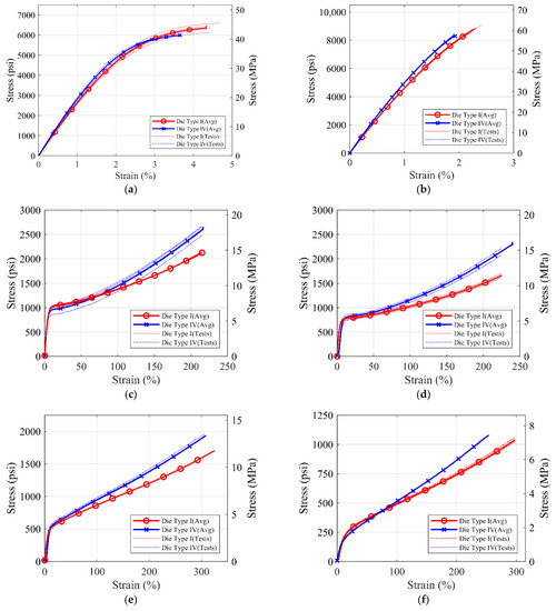 Load and displacement data acquired by the Instron UTM are post-processed to get stress–strain values for the tests. Engineering stress values are calculated by dividing the load values by the initial coupon sectional area at the narrow section, i.e., desired failure location. Engineering strain values are obtained by dividing the extension values to the original grip spacing measured at the start of the test. Figure 5 shows the average tensile stress–strain plot generated by averaging the stress values at constant strain values from all tested coupons for different die types and polyurea material types.
