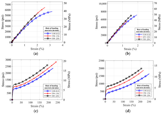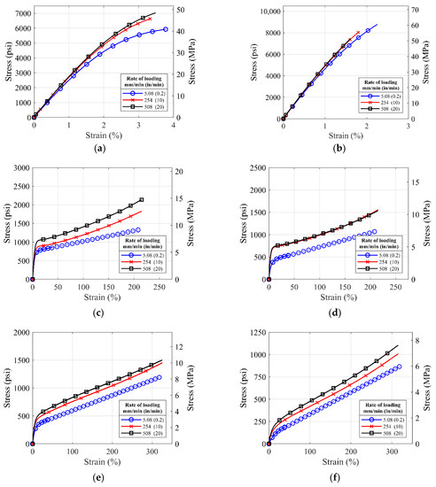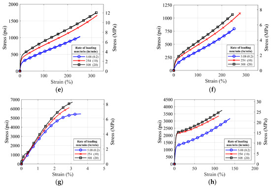 Figure 7 and Figure 8 show the average stress–strain curves generated from the rate-dependent tests on the different commercial polyurea. For the loading rate of 0.2 in/min and die type I coupons of S3, S4, S5, and S6 materials, test to failure encountered grip slippage problems and long test time. So, the tests were terminated at the elongation of 2 in. The dotted lines are the projected estimate for the tests terminated.
