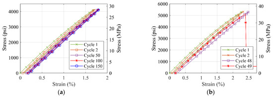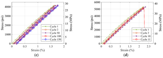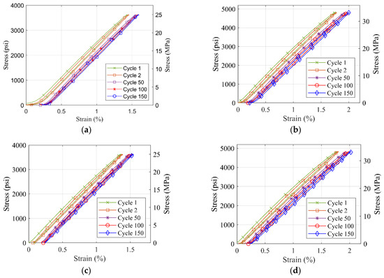 For both tested polyurea material types, it is observed that the slope of the stress–strain curve does not seem to change drastically, but a small plastic deformation is observed in each cycle of the fatigue loading that accumulates with every cycle. These results suggest that a further in-depth study of the fatigue load behavior for the polyurea material is needed, which is suggested for future work.