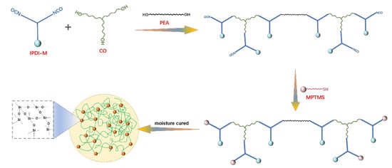 - Li, Q.; Guo, L.; Qiu, T.; Xiao, W.; Du, D.; Li, X. Synthesis of waterborne polyurethane containing alkoxysilane side groups and the properties of the hybrid coating films. Appl. Surf. Sci. 2016, 377, 66–74. [Google Scholar] [CrossRef]