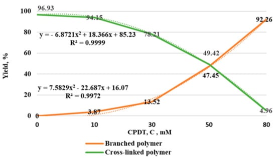 The graph (Figure 1) illustrates that the yield dependence of the branched polymer increased in proportion to the square of the concentration of the RAFT agent. Correspondingly, the yield of the cross-linked copolymer decreased in proportion to the square of its concentration [18].