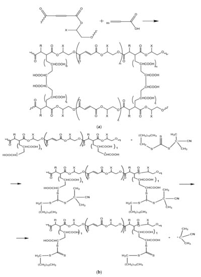 - Burkeyev, M.Z.; Zhunissova, M.S.; Plocek, J.; Kazhmuratova, A.T.; Zhumagalieva, T.S. Properties of cross-linked copolymers of polypropylene glycol maleate with acrylic acid obtained at various concentrations of the RAFT agent. Bull. Univ. Karaganda-Chem. 2022, 105, 15–24. [Google Scholar] [CrossRef]