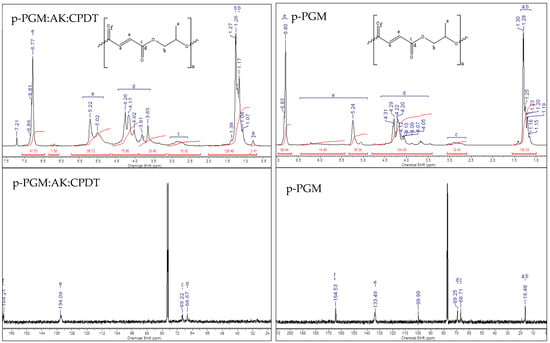 The 1H and 13C NMR spectra of the resulting branched copolymers p-PGM:AA:CPDT and the starting p-PGM oligomer were recorded on JNM-ECA Jeol 400 spectrometer (frequency 399.78 and 100.53 MHz, respectively) using a CDCl3 solvent. Chemical shifts were measured relative to the signals of residual protons or carbon atoms of deuterated chloroform.