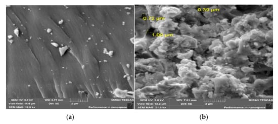 On the micrograph (Figure 4), it was observed that the surfaces of the particles of p-PGM:AA samples (a) had hard and brittle cleavage sites.