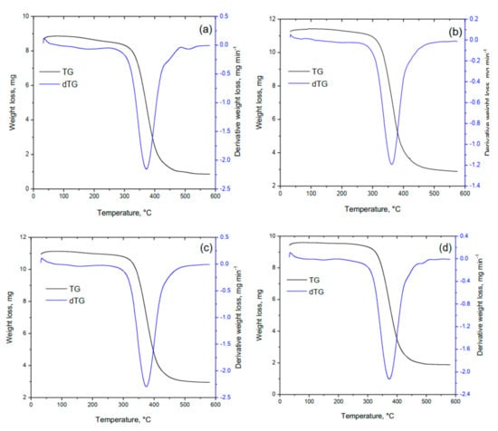 TG curves of analysis of p-PGM:AA copolymer (a) and p-PGM:AA:CPDT copolymers obtained in the presence of 10 mM (b), 30 mM (c), 50 mM (d) RAFT-agent.