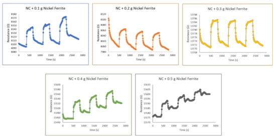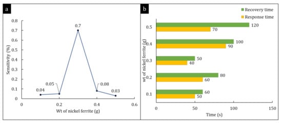 - Kamble, R.B.; Mathe, V.L. Nanocrystalline nickel ferrite thick film as an efficient gas sensor at room temperature. Sens. Actuators B Chem. 2008, 131, 205–209. [Google Scholar] [CrossRef]