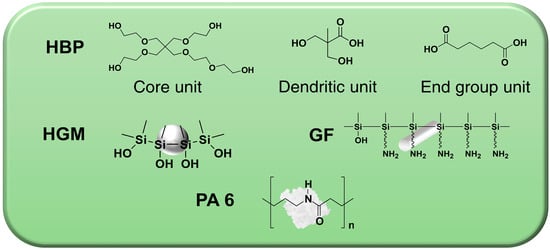 Chemical structures of PA 6, HGM, GF, and HBP.