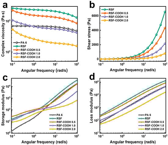 Complex viscosity (a), shear stress (b), storage modulus (c), and loss modulus (d) of the neat PA6 and RSF composites with different HBP contents.
