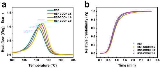 DSC thermograms cooled at 10 °C/min (a) and plots of relative crystallinity (Vt) vs time (b) for non-isothermal crystallization of RSF composites with various HBP contents.
