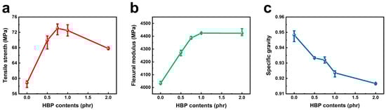 Tensile strength (a), flexural modulus (b), and the specific gravity (c) of the RSF with various contents of HBP.