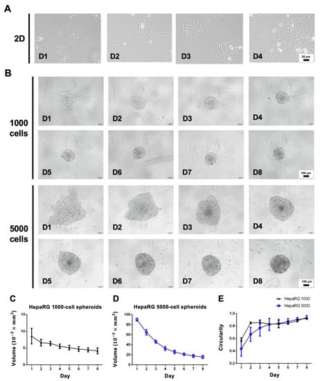 Morphological assessment of 2D and 3D cultures. (A) HepaRG cells cultured under 2D conditions. Scale bar, 100 µm. (B) Aggregation processes of HepaRG spheroids with different cell concentrations (1000 and 5000 cells per well) over time. Scale bar, 100 µm. (C) Quantification of the HepaRG 1000 cell spheroid volume from days 1 to 8. (D) Quantification of the HepaRG 5000 cell spheroid volume from days 1 to 8. (E) Circularity of spheroids over time.
