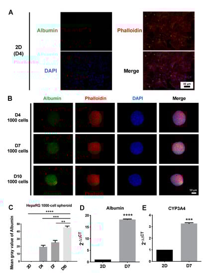 Identification of functional proteins by immunofluorescence staining of albumin (green), phalloidin (red) and nuclei (blue). (A) Immunofluorescence staining of HepaRG cells under 2D culture conditions at days 4. Scale bar, 50 µm. (B) Immunofluorescence staining of HepaRG 1000-cell spheroids after 4, 7, and 10 days in culture. Scale bar, 50 µm. (C) Analysis of the fluorescence intensity of albumin per area obtained with HepaRG 2D cells and 3D spheroids. ** p < 0.01, Day 10 vs. Day 7; *** p < 0.001, Day10 vs. Day4; **** p < 0.0001, Day10 vs. 2D cells. (D,E) Delta-Delta Ct method for qPCR data analysis of Albumin and CYP3A4 in HepaRG 2D culture and 1000-cell spheroids grown in suspension. The ∆∆Ct is relative to the average of 2D ∆Ct.