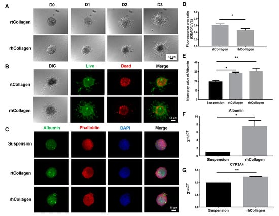 With the aim of promoting HepaRG spheroid differentiation and shortening the time required for the formation of functional spheroids, we studied HepaRG spheroids embedded in rtCollagen or rhCollagen I. Morphology assessment showed that the spheroids embedded in either type of collagen type I continued to grow and be supported by a 3D ECM network by protruding from the periphery of the spheroids and growing outward to form a dendritic structure (Figure 4A). In addition, the embedded spheroids had appropriate viability, although the interior spheroids still presented a dead signal due to hypoxia and a lack of nutrients [29] (Figure 4B,D), and they had a good 3D structure according to the dense network structure of actin filaments (Figure 4C). The results from our functional validation experiment confirmed that HepaRG spheroids embedded in rtCollagen or rhCollagen I exhibited better hepatic function than spheroids grown in suspension, as demonstrated by the examination of hepatocyte-specific functional proteins through an immunofluorescence analysis of albumin and qPCR analysis of albumin and CYP3A4 (Figure 4E–G). These results indicate the important role of collagen I in promoting HepaRG differentiation and reducing the time needed for spheroid formation. The average fluorescence intensity of the spheroids embedded into rhCollagen was slightly higher than that of the spheroids embedded into rtCollagen, but there was no significant difference between the two values (Figure 4E). While whether rhCollagen I can better promote HepaRG differentiation than rtCollagen I remains to be confirmed, what is certain is that we can effectively shorten the time required to form functional spheroids by the addition of collagen I, and the choice of human recombinant collagen greatly paves a reliable source for reproducible and predicable ECM for human hepatocyte culture. Therefore, we envision this play a pivotal role in providing insights for the development of an in vitro liver model and for the assessment of drug toxicology.