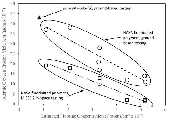 | Polymer Type | Repeat Unit | Molar Mass (g/mol) | Density (g/cm3) | Atomic Oxygen Erosion Yield (cm3/atom × 10−25) | Estimated Fluorine Concentration (F atoms/cm3 × 1022) | |