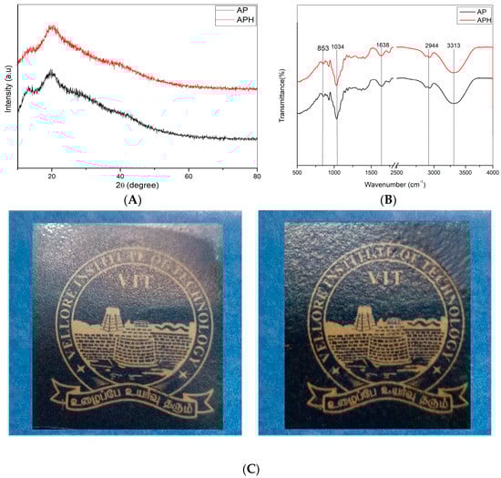 (A) XRD image. (B) FTIR spectrum. (C) Film transparency of AP and APH films.