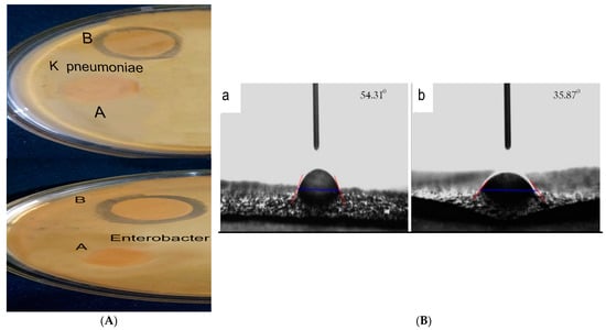 (A) Antimicrobial property of film’s with different bacterial culture A) AP and B) APH. (B) Water Contact Angle of (a) AP and (b) APH.