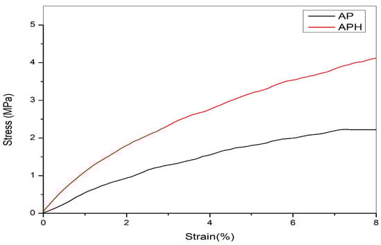 Figure 4 shows that when strain increases, stress rises until it reaches a maximum value before falling. The findings showed that adding the extract improves the mechanical characteristics. According to Roy et al., the inclusion of GSE and MNP enhanced the polymer’s strength []. Consequently, HA extract improves the mechanical characteristics of APH wound healing materials.