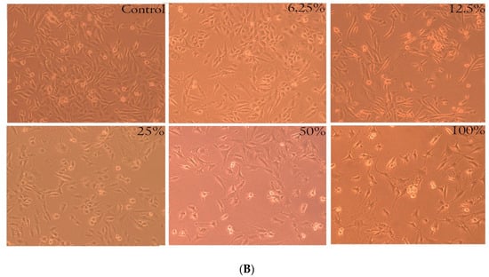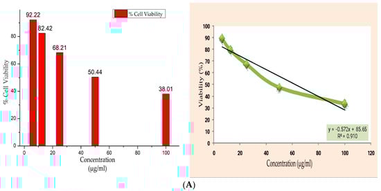In order to assess cell viability, proliferation, and cytotoxicity, the MTT assay was used to measure cellular metabolic activity. SKMEL-26 (2500 cells/well) were seeded on 96-well plates and allowed to acclimate for 24 h to the culture conditions of 37 °C and 5% CO2 in the incubator. The test samples were prepared in DMEM (100 mg/mL) media and filtered with a 0.2 m Millipore syringe filter and further diluted in DMEM media, the samples were added to the wells containing the cultured cells at final concentrations of 6.25, 12.5, 25, 50, and 100 µg/mL, respectively. The untreated wells served as the control. To reduce the possibility of error, each experiment was conducted in triplicate, and the mean values were calculated. Plates were incubated for 24 h following treatment with test samples. After the incubation period, the media was aspirated from the wells and discarded. A total of 100 L of an MTT solution containing 0.5 mg/mL in PBS was added to each well. The plates were incubated for an additional two hours to facilitate the formation of formazan crystals. The supernatant was discarded, and 100 µL of 100 percent DMSO was added to each well. Using a micro plate reader, absorbance at 570 nm was measured. Two wells per plate serving as blanks were devoid of cells []. Each experiment was conducted in triplicate. Using the following formula, the cell viability was expressed: