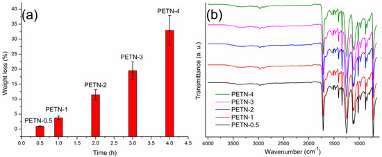 (a) Weight loss of PET films in the aminolysis reaction at different times, (b) IR-ATR spectra of PET films after aminolysis reaction at different times.