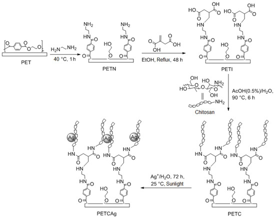 One of the most widely used materials in food and medical device packaging is polyethylene terephthalate (PET) due to its excellent mechanical properties and chemical stability under several conditions [7], availability, and low production cost. Therefore, PET is an ideal candidate for its use as antibacterial surfaces [8]. Approaches to providing antimicrobial activity can be classified into two types: the first can be achieved by incorporating antimicrobial agents into the polymeric matrix, and the second by modifying the surface and coating it with antimicrobial agents [9,10]. The latter approach is one of the most widely used since it significantly maintains the polymeric matrix’s original properties. This approach can be carried out through different methodologies, such as using covalently bonded coatings, which make them more stable in different physical–chemical environments. Antimicrobial coatings can be polymers from a natural or synthetic origin, providing new properties to the original material such as stimulus-response [11], bacteriostatic effects [12], biocompatibility [13], or allowing the loading and stabilization of nanomaterials [14]. In this context, chitosan, which is a polymer of natural origin, has shown antimicrobial activity against different pathogenic microorganisms with a high mortality rate and low toxicity to humans in various studies, making this polymer suitable for different applications in food [15], drug-delivery [16,17], biomedical devices [18,19], and other chemistry fields [20]. Chitosan is also used to stabilize and load nanoparticles synthesized using different methods [21,22] and to add new functional properties to coated nanoparticles by using chitosan as a carrier, such as in magnetic drug delivery systems [23,24]. Moreover, some nanoparticles are capable of providing antimicrobial activity through the release of metallic ions that affect the integrity of microorganisms, causing their death, as is the case with silver nanoparticles [25].