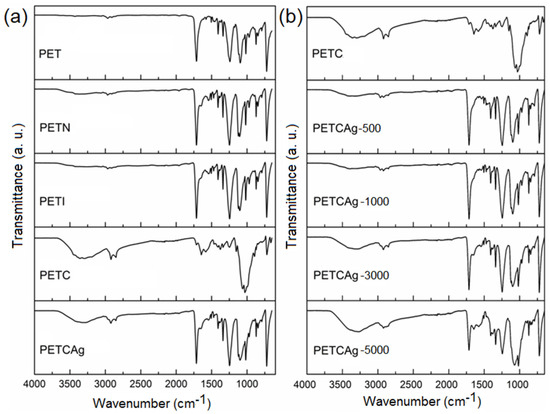 (a) FTIR-ATR spectra of PET films in the chitosan chain grafting process; (b) FTIR-ATR spectra of the PETC films loaded with silver nanoparticles in different silver nitrate concentrations.