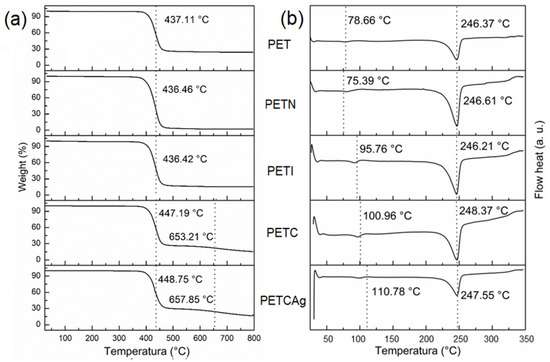 The thermogravimetric analysis (Figure 5a and Table 2) shows that the films have a decomposition temperature range of 436 to 448 °C. However, after 460 °C, PETC and PETCAg films show a second decomposition range, which is attributed to the decomposition of the chitosan grafted onto the film. The amount of the residue yield obtained is shown in Table 2. DSC studies show that the melting temperature of the PET film (246 °C) was not affected by the grafting process. The PET film’s glass transition (Tg) shows an increase in the grafting process. When itaconic acid was incorporated, the Tg of PETI increased from 78.6 to 95.6 °C; the addition of chitosan raised the Tg to 100.9 °C. Loading of silver nanoparticles elevated the Tg of the PETCAg to 110.7 °C, probably due to the strong interactions of the polymer chains with the silver nanoparticles (Figure 5b) [33].