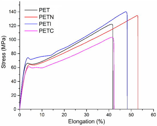 Tensile stress–strain graph of PET films in the process of grafting chitosan polymer chains.